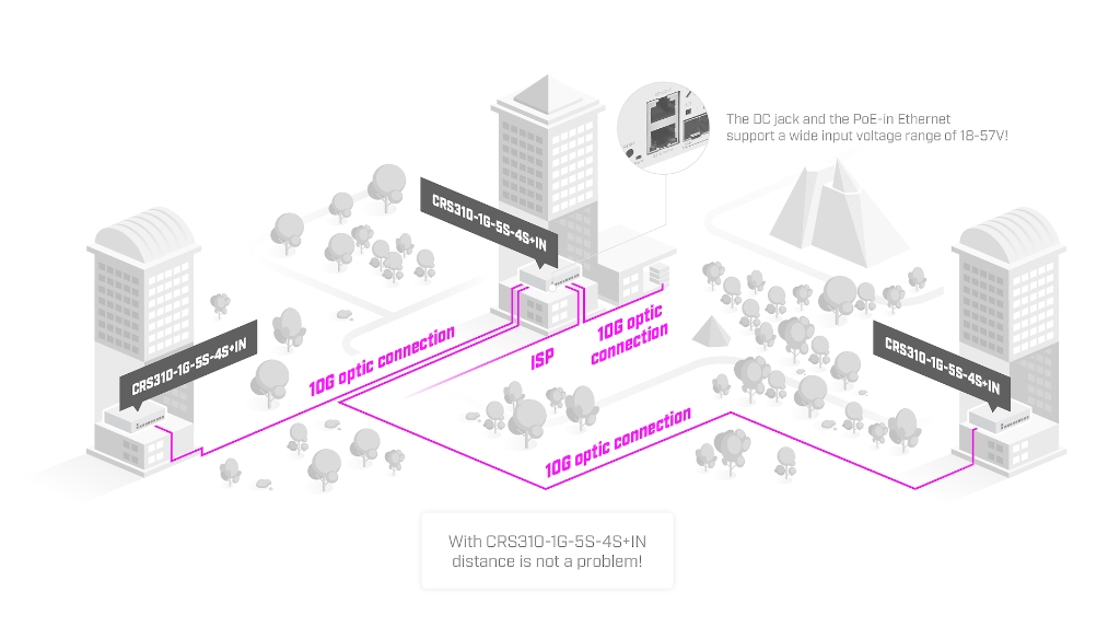 CRS310-1G-5S-4S+IN, pek çok küçük/orta ISP’nin sevdiği mimariyi indoor ortama taşır: 4× 10G SFP+ ve 5× 1G SFP ile erişim fiberlerini tek kasada toplayıp rack’te 1U düzenli kablolama sağlar. GbE portu switch-chipe doğrudan bağlıdır; yönetim ya da yedek erişim için tam gigabit hız verir ve PoE-in destekleyerek zor noktalarda tek kablo ile beslemeyi mümkün kılar. Marvell switch-chip + ARM v7 kombinasyonu; VLAN filtreleme HW offload, ACL, LACP, Jumbo ve seçili L3 offload ile dağıtım/erişim katında tel hızına yakın anahtarlamayı hedefler. Elektromanyetik etkileşim, dinleme ya da tamper riski olan alanlarda bakıra alternatif optik omurga kurmak için idealdir.