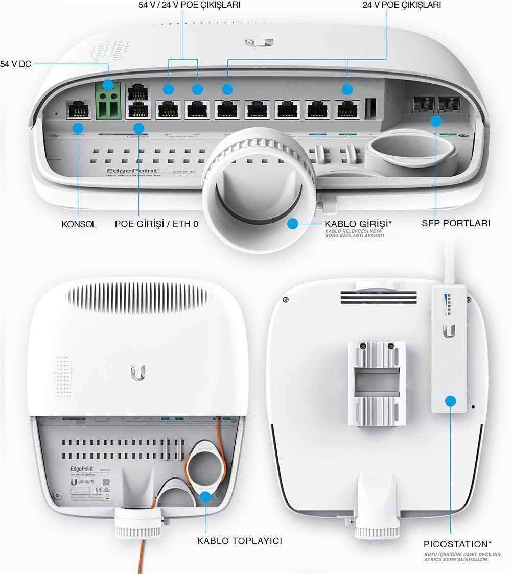 UBNT EdgePoint ürün grubu, EP-R6 ve EP-R8 modelinde sunulan gelişmiş yönlendirme (Routing) altyapısı ile kablosuz bağlantılarınızın Yük dengeleme (Load Balancing), ve Hat yedekleme (Failover) gibi ihtiyaçlarına stabil ve performanslı bir çözüm üretirken, EP-S16 modelinde ise Layer 2 bağlantı kümelemesi ( link aggregation) ile diğer EdgePoint ürünleri ile benzer performans ve stabilite sunmaktadır. Rüzgar, yağmur, kar gibi zorlu hava koşullarına dayanlıklı olacak sekilde üretilmiş muhafazası ile bütünleşik bir tasarım anlayışı sunan UBNT EdgePoint ürün grubu, bu tasarım anlayışı sayesinde projelerinizi pahalı dış mekan kabin masraflarından kurtarırken, sunulan kablo yötetim çözümleri sayesinde düzenli bir kurulum gerçekleştirmenize olanak sağlayarak kurulum ve kurulum sonrası bakım sürelerinde zamandan tasarruf etmenizi sağlar. İki farklı güç besleme alternatifi sunan UBNT EdgePoint ürün grubu doğrudan DC elektrik bağlantısı ile veya PoE olarak da çalıştırılabilmektedir. EP-R6 modelinde 5 adet Gigabit ethernet portundan 24V 0.7A Pasif PoE çıkışı elde edilebilirken, EP-R8 modelinde 2 Gigabit Ethernet Portu 24V 1A PoE veya 54V 1 A PoE çıkış için, 5 adet Ethernet portu 24V 0.7 A PoE çıkışı için ayrılmıştır. 5 EP-S16 modelinde ise 2 Gigabit Ethernet Portu 24V 1A PoE veya 54V 1 A PoE girişi veya çıkış için, 12 adet Gigabit ethernet portu 24V 0.7 A PoE çıkışı için ayrılmıştır.